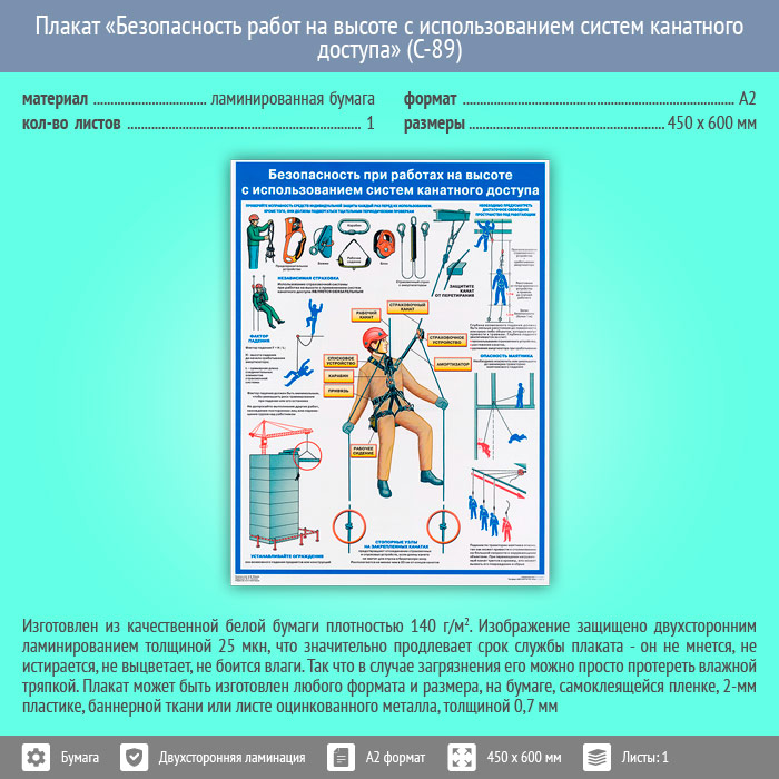 Плакат «Безопасность работ на высоте с использованием систем канатного доступа» (С-89, ламинированная бумага, А2, 1 лист) в Череповце купить