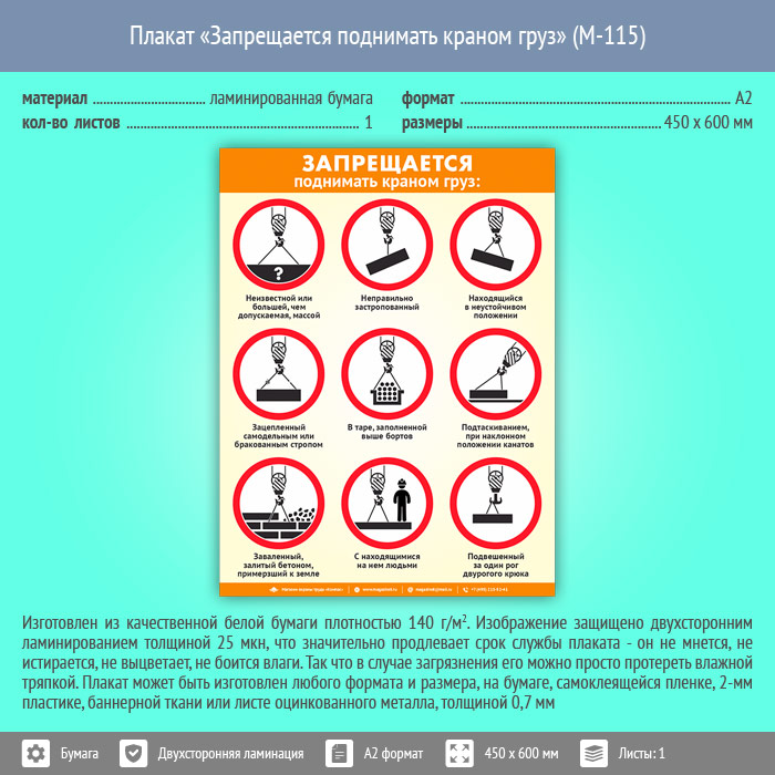 Плакат «Запрещается поднимать краном груз» (М-115, ламинированная бумага, А2, 1 лист) в Череповце купить