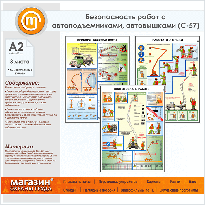 Плакаты «Безопасность работ с автоподъемниками, автовышками» (С-57, ламинированная бумага, А2, 3 листа) в Череповце купить