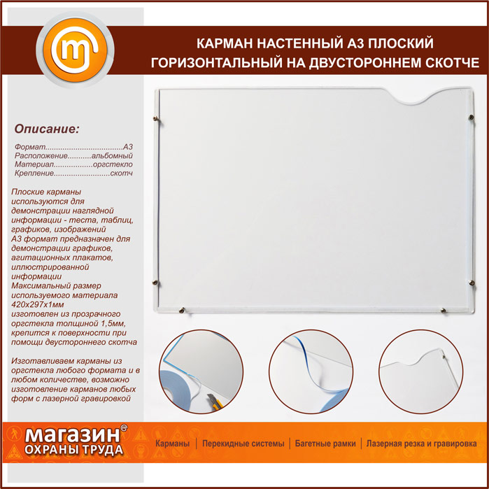 Карман настенный А3 плоский горизонтальный на двустороннем скотче в Череповце купить