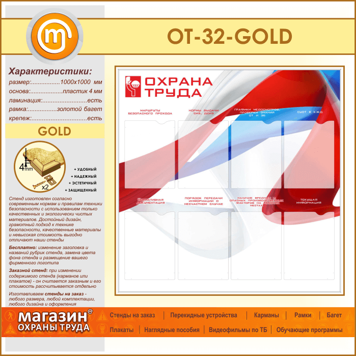Стенд «Охрана труда» с 8 карманами (OT-32-GOLD) в Череповце купить