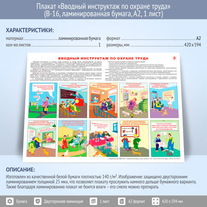 Плакат «Вводный инструктаж по охране труда» (В-16, ламинированная бумага, А2, 1 лист) в Череповце купить