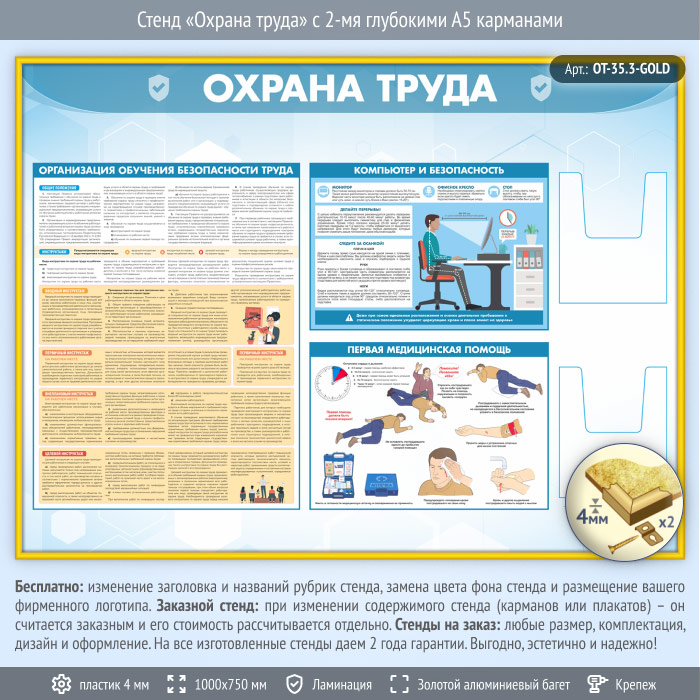 Стенд «Охрана труда» с 2-мя глубокими А5 карманами (OT-35.3-GOLD) в Череповце купить