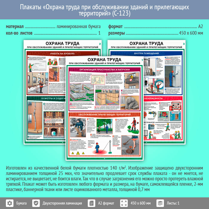 Плакаты «Охрана труда при обслуживании зданий и прилегающих территорий» (С-123, ламинированная бумага, А2, 3 листа) в Череповце купить