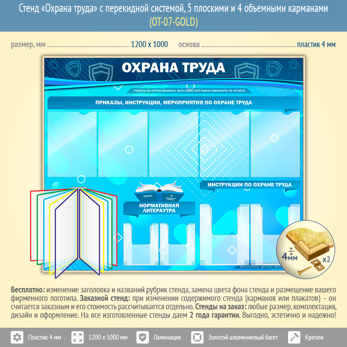 Стенд «Охрана труда» с перекидной системой, 5 плоскими и 4 объемными карманами (OT-07-GOLD) в Череповце купить