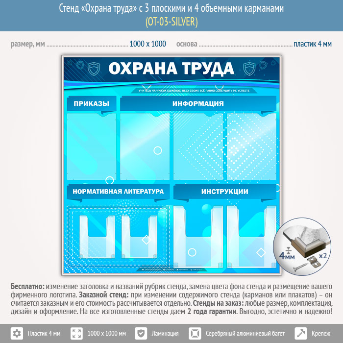 Стенд «Охрана труда» с 4 плоскими и 4 объемными карманами (OT-03-SILVER) в Череповце купить