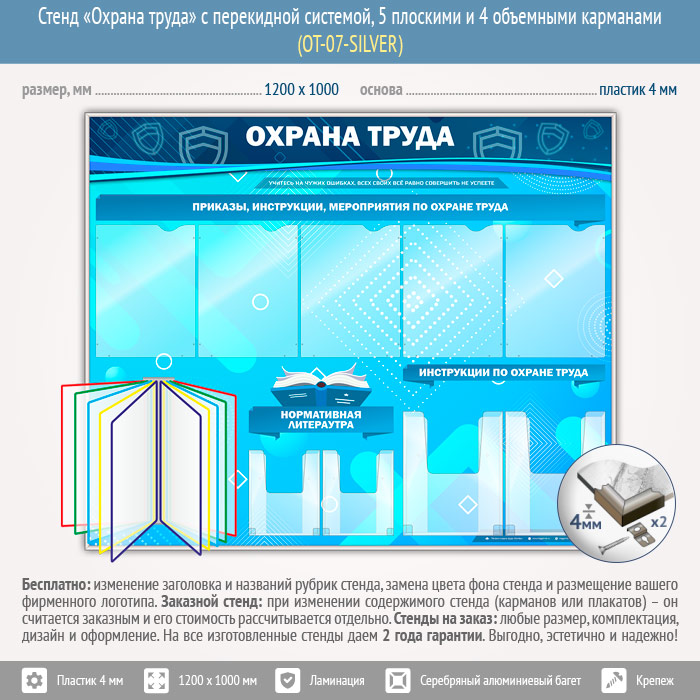 Стенд «Охрана труда» с перекидной системой, 5 плоскими и 4 объемными карманами (OT-07-SILVER) в Череповце купить
