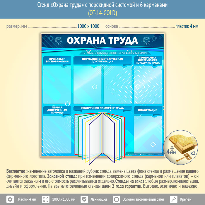 Стенд «Охрана труда» с перекидной системой и 6 карманами (OT-14-GOLD) в Череповце купить