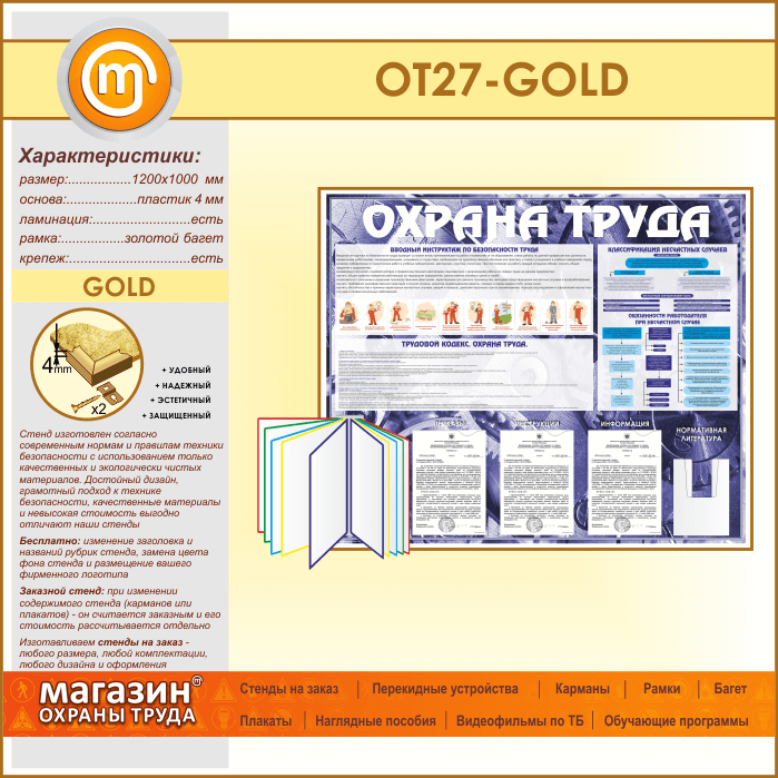 Стенд «Охрана труда» с перекидной системой, 3 плоскими и 1 объемным карманом (OT-27-GOLD) в Череповце купить