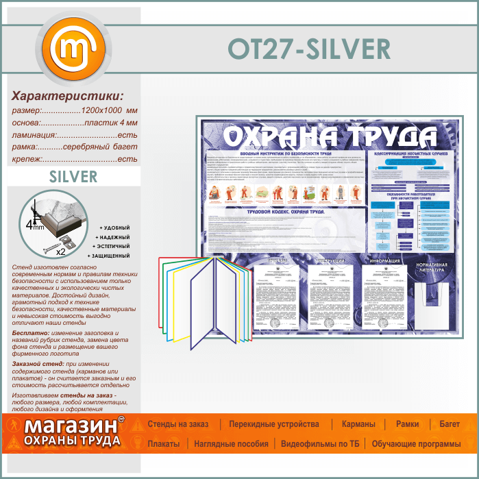 Стенд «Охрана труда» с перекидной системой, 3 плоскими и 1 объемным карманом (OT-27-SILVER) в Череповце купить