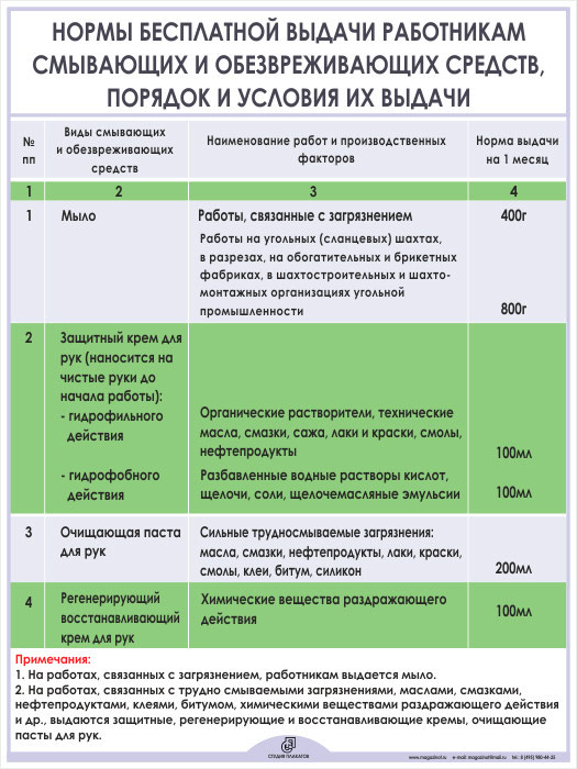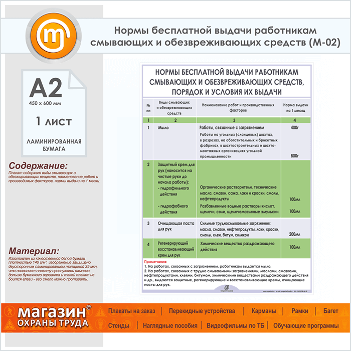 Плакат «Нормы бесплатной выдачи работникам смывающих и обезвреживающих средств» (М-02, ламинированная бумага, А2, 1 лист) в Череповце купить