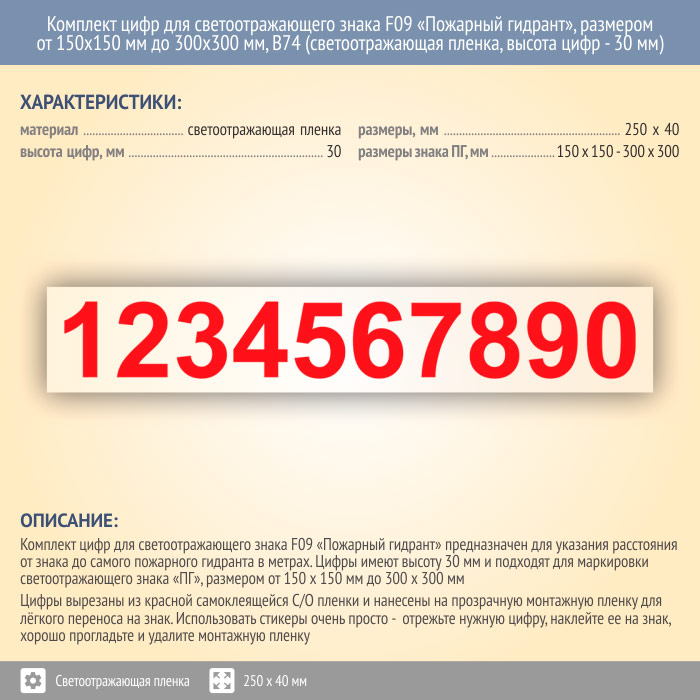 Комплект цифр для светоотражающего знака F09 «Пожарный гидрант», размером от 150х150 мм до 300х300 мм, В74 (светоотражающая пленка, 250х40 мм, высота цифр - 30 мм) в Череповце купить