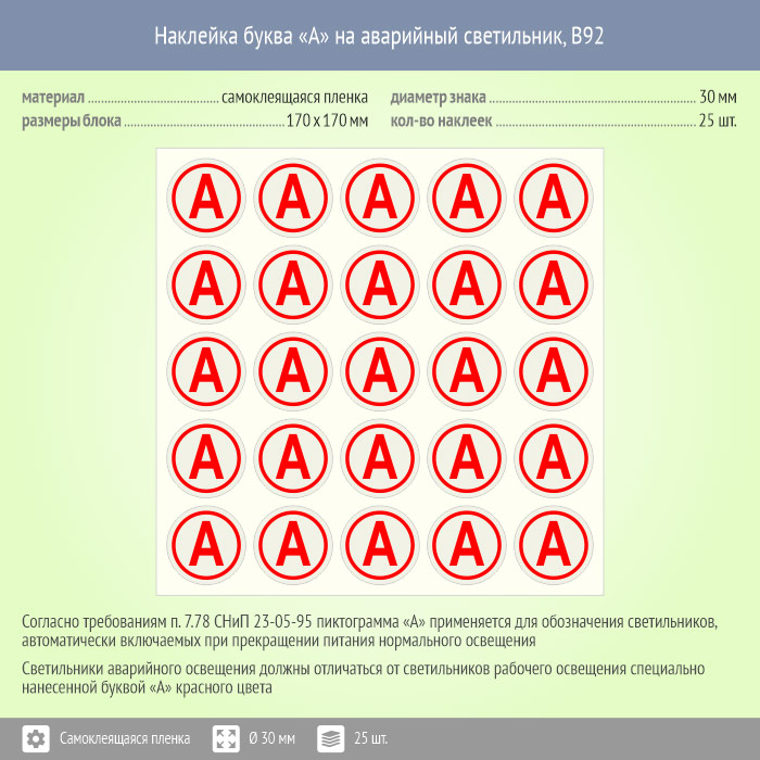 Наклейка буква «А» на аварийный светильник, B92 (пленка, диаметр 30 мм, блок 25 штук, 170х170 мм) в Череповце купить