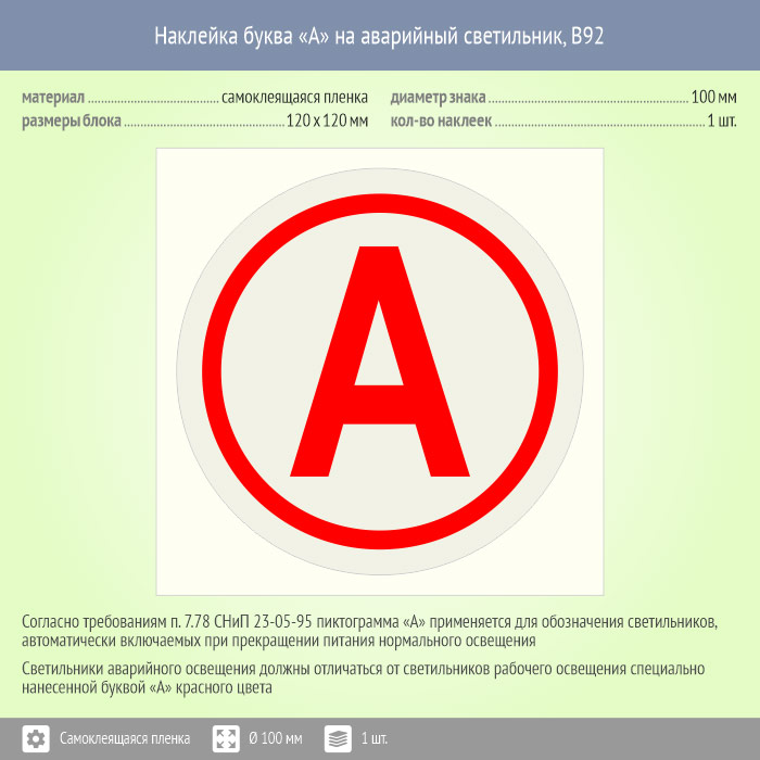 Наклейка буква «А» на аварийный светильник, B92 (пленка, диаметр 100 мм, 120х120 мм) в Череповце купить