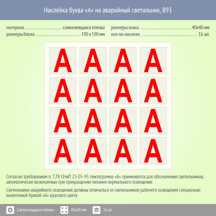 Наклейка буква «А» на аварийный светильник, B93 (пленка, 40х40 мм, блок 16 штук, 190х190 мм) в Череповце купить