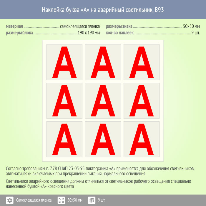 Наклейка буква «А» на аварийный светильник, B93 (пленка, 50х50 мм, блок 9 штук, 190х190 мм) в Череповце купить