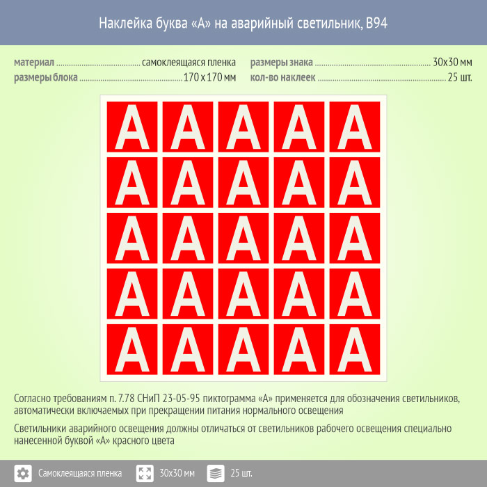 Наклейка буква «А» на аварийный светильник, B94 (пленка, 30х30 мм, блок 25 штук, 170х170 мм) в Череповце купить