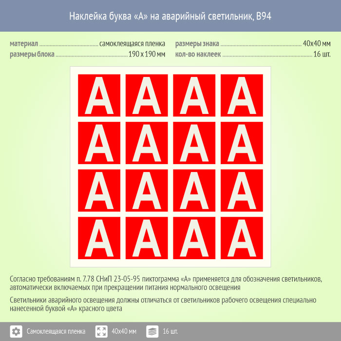 Наклейка буква «А» на аварийный светильник, B94 (пленка, 40х40 мм, блок 16 штук, 190х190 мм) в Череповце купить