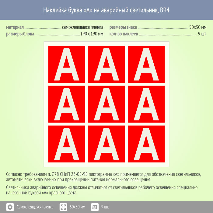Наклейка буква «А» на аварийный светильник, B94 (пленка, 50х50 мм, блок 9 штук, 190х190 мм) в Череповце купить