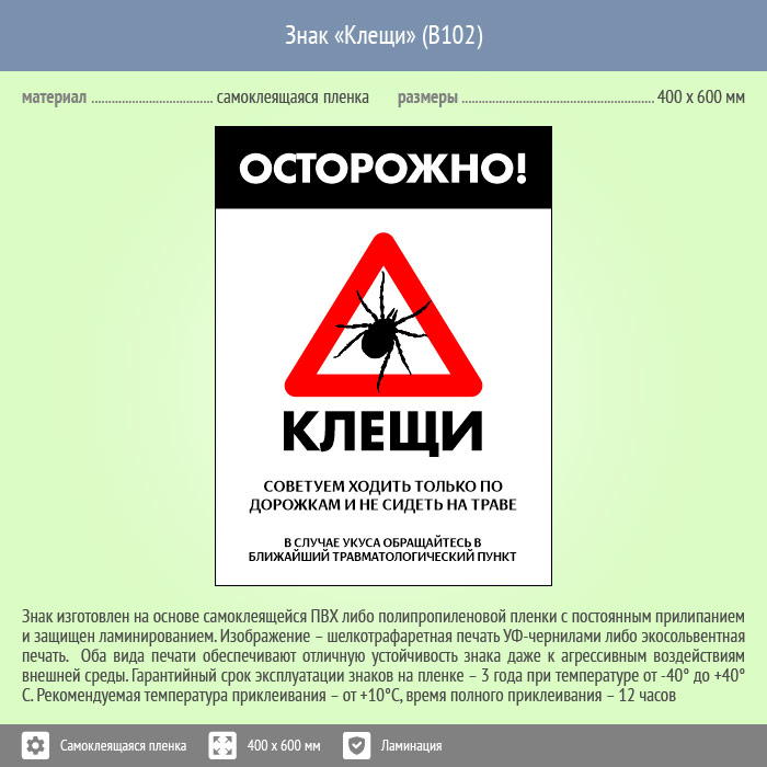 Знак «Осторожно! Клещи», B102 (пленка c ламинированием, 300х400 мм) в Череповце купить
