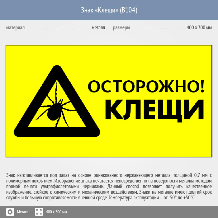 Знак «Осторожно! Клещи», B104 (металл, 300х200 мм) в Череповце купить