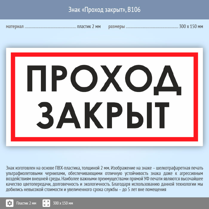 Знак «Проход закрыт», B106 (пластик, 300х150 мм) в Череповце купить