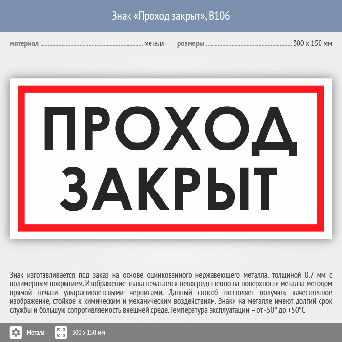 Знак «Проход закрыт», B106 (металл, 300х150 мм) в Череповце купить