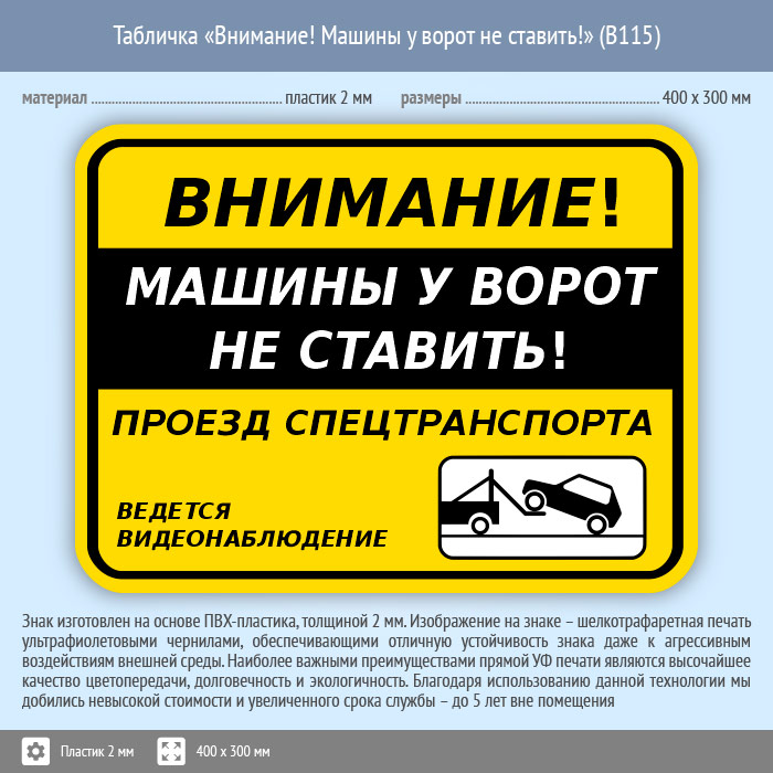 Табличка «Внимание! Машины у ворот не ставить!», B115 (пластик, 400х300 мм) в Череповце купить