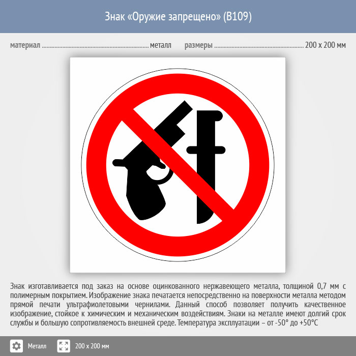 Знак «Оружие запрещено», B109 (металл, 200х200 мм) в Череповце купить