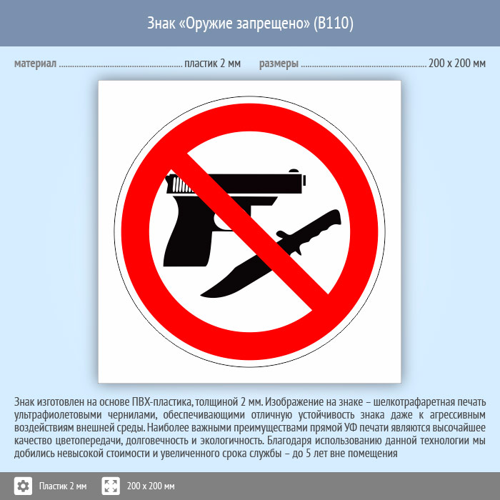 Знак «Оружие запрещено», B110 (пластик, 200х200 мм) в Череповце купить