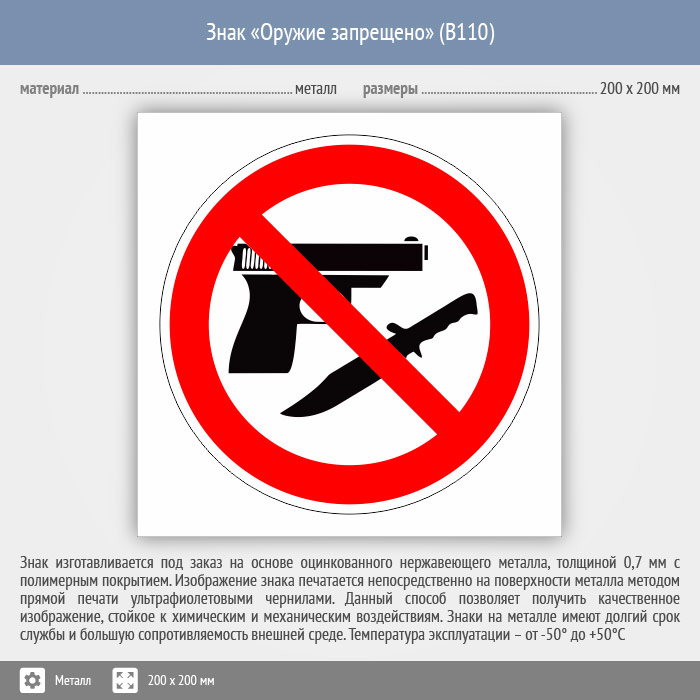 Знак «Оружие запрещено», B110 (металл, 200х200 мм) в Череповце купить