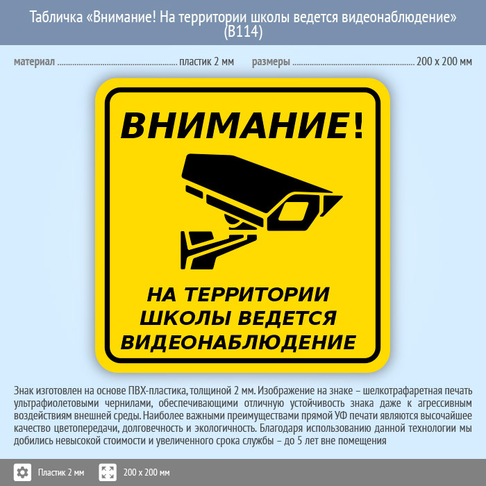 Табличка «Внимание! На территории школы ведется видеонаблюдение», B114 (пластик, 200х200 мм) в Череповце купить