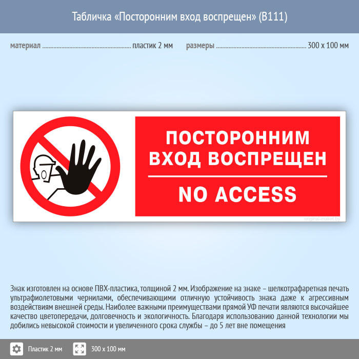 Табличка «Посторонним вход воспрещен», B111 (пластик, 300х100 мм) в Череповце купить