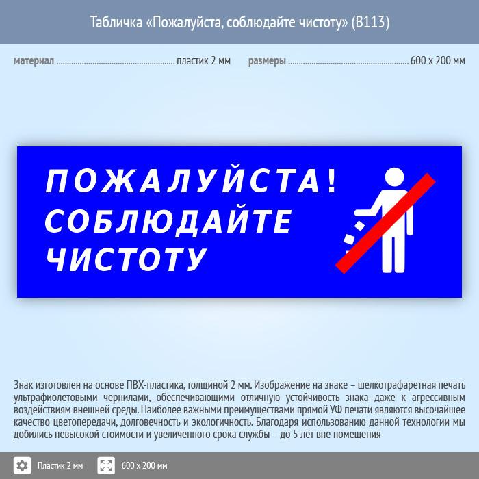 Табличка «Пожалуйста, соблюдайте чистоту», B113 (пластик, 600х200 мм) в Череповце купить