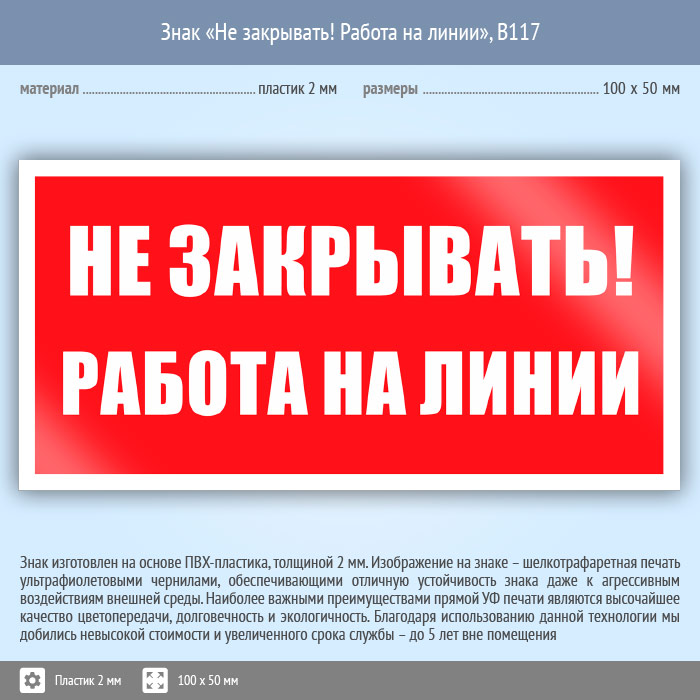 Знак «Не закрывать! Работа на линии», B117 (пластик, 100х50 мм) в Череповце купить