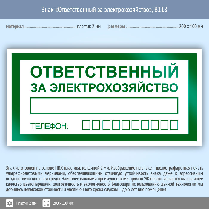 Знак «Ответственный за электрохозяйство», B118 (пластик, 200х100 мм) в Череповце купить