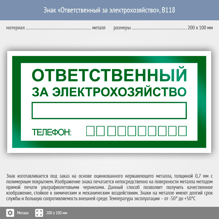 Знак «Ответственный за электрохозяйство», B118 (металл, 200х100 мм) в Череповце купить