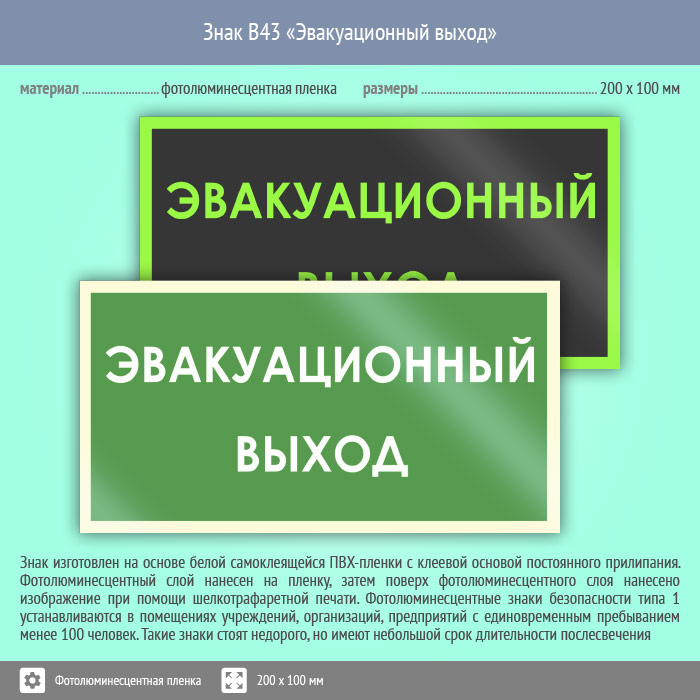 Знак B43 «Эвакуационный выход» (фотолюминесцентная пленка ГОСТ 34428-2018, 200х100 мм) в Череповце купить