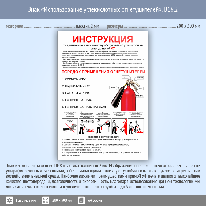 Знак «Использование углекислотных огнетушителей», B16.2 (пластик, 200х300 мм) в Череповце купить
