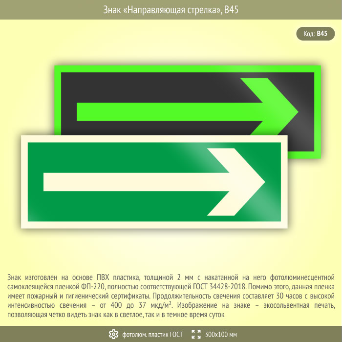 Знак «Направляющая стрелка», B45 (фотолюминесцентный пластик ГОСТ 34428-2018, 300х100 мм) в Череповце купить