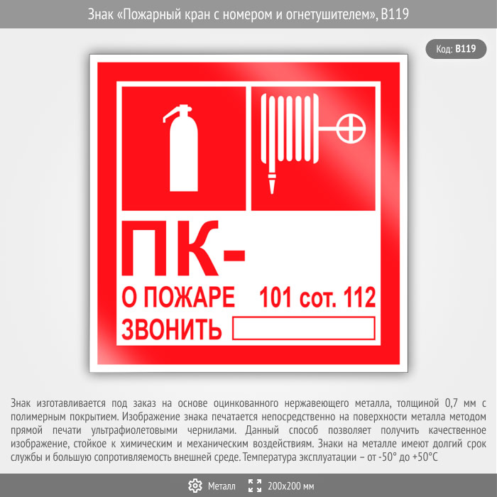 Знак «Пожарный кран с номером и огнетушителем», B119 (металл, 200х200 мм) в Череповце купить