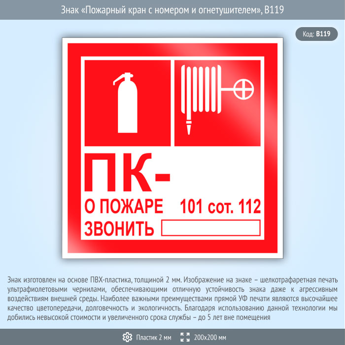 Знак «Пожарный кран с номером и огнетушителем», B119 (пластик, 200х200 мм) в Череповце купить