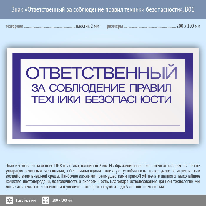 Знак «Ответственный за соблюдение правил техники безопасности», B01 (пластик, 200х100 мм) в Череповце купить