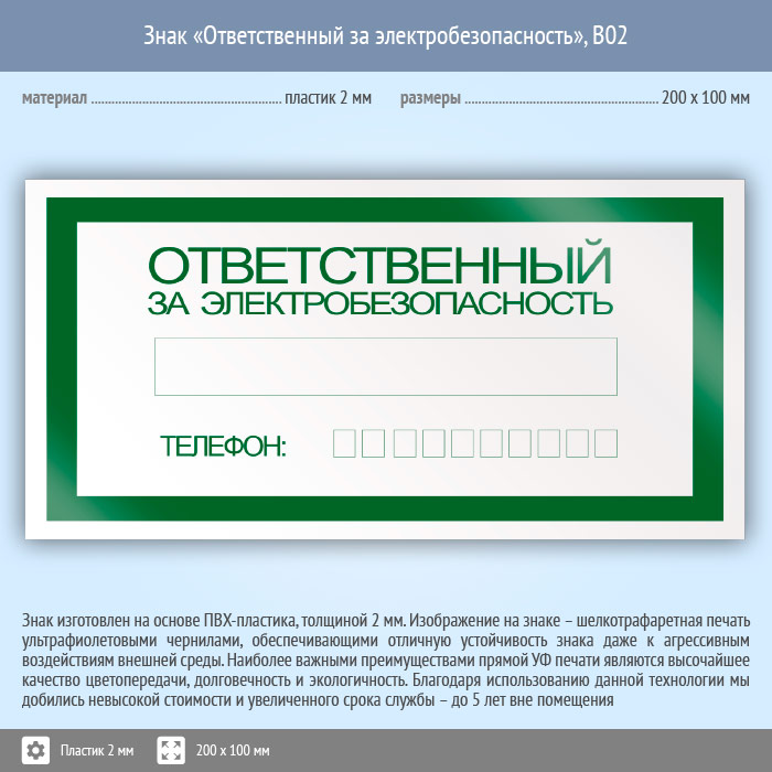 Знак «Ответственный за электробезопасность», B02 (пластик, 200х100 мм) в Череповце купить