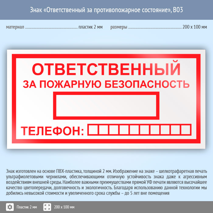 Знак «Ответственный за пожарную безопасность», B03 (пластик, 200х100 мм) в Череповце купить