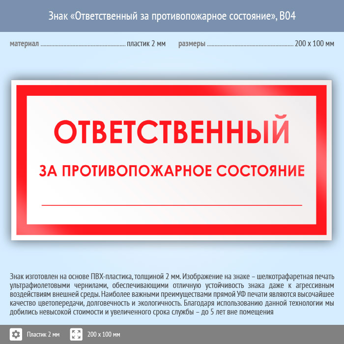 Знак «Ответственный за противопожарное состояние», B04 (пластик, 200х100 мм) в Череповце купить