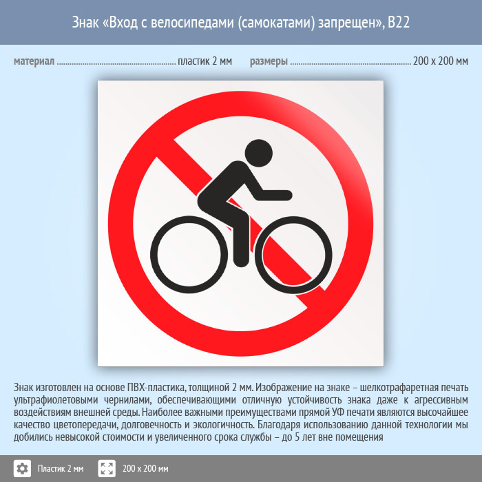 Знак «Вход с велосипедами (самокатами) запрещен», B22 (пластик, 200х200 мм) в Череповце купить