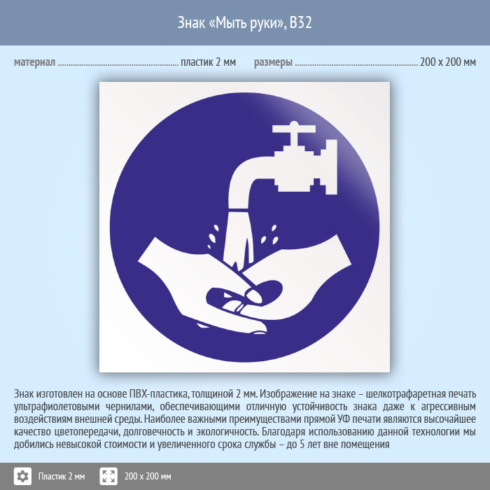 Знак «Мыть руки», B32 (пластик, 200х200 мм) в Череповце купить