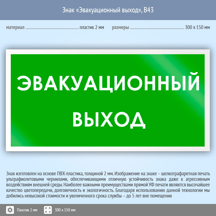 Знак «Эвакуационный выход», B43 (пластик, 300х150 мм) в Череповце купить