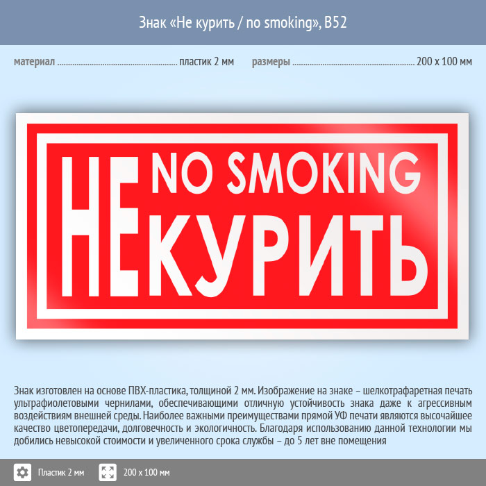Знак «Не курить / no smoking», B52 (пластик, 200х100 мм) в Череповце купить